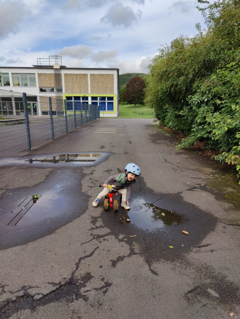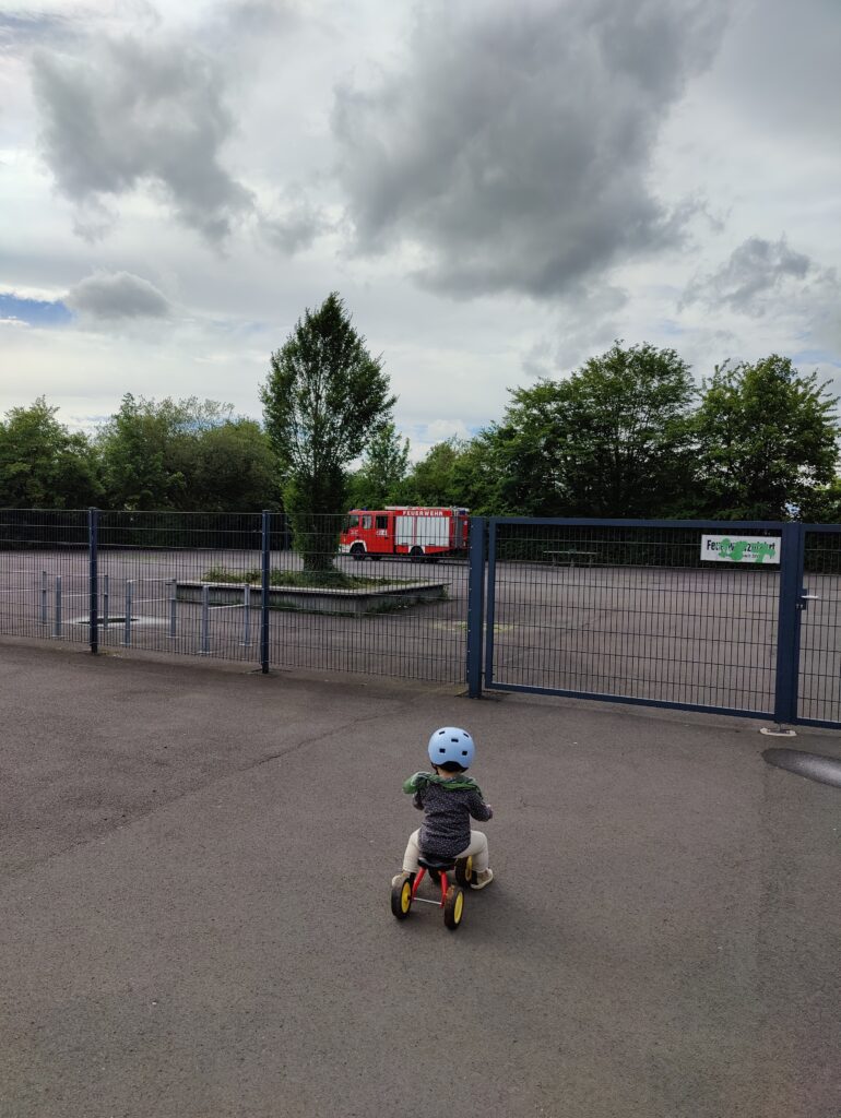 Papa und Mika haben vormittags noch eine Runde mit dem Laufrad gedreht. Da war die Energie aber vielleicht schon etwas aufgebraucht. Mika hat vor dem tollen Rasenmähtrecker geweint, weil der ihm dann doch etwas unheimlich war. Auf dem Spielplatz und dem Weg war dann aber alles gut.