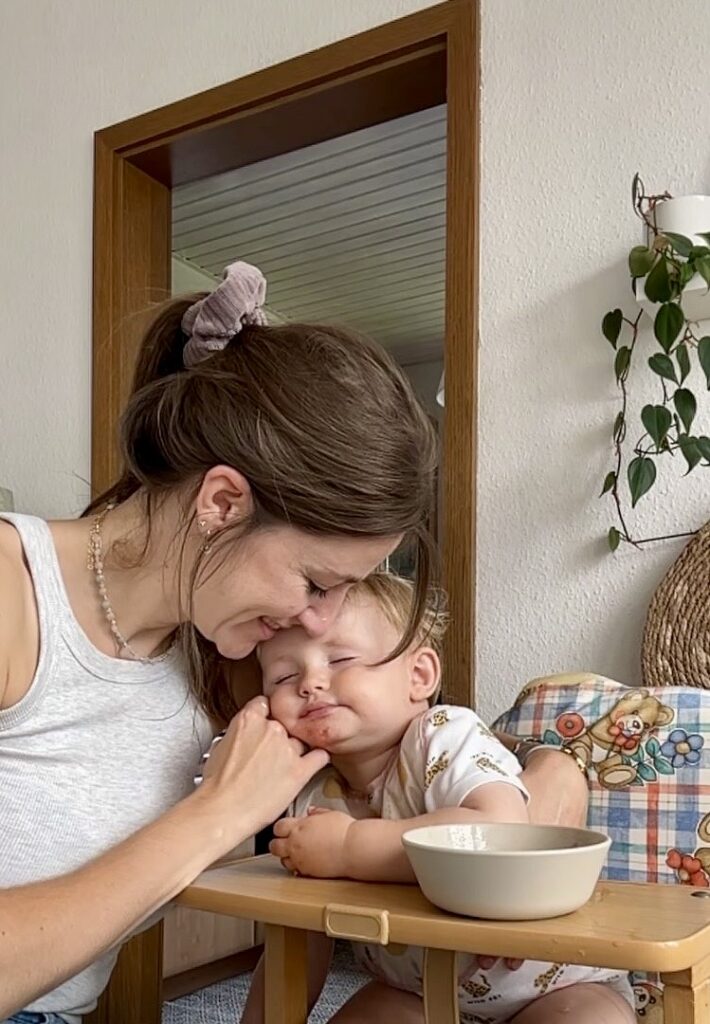 Mika ist zu Hause dann wieder in seinem Stuhl beim Essen eingeschlafen. Er war ganz erschöpft. Sogar so sehr, dass Mama ihn aus dem Stuhl nehmen und eine neue Windel anziehen konnte.