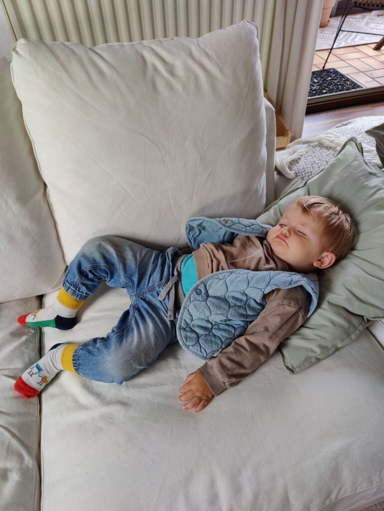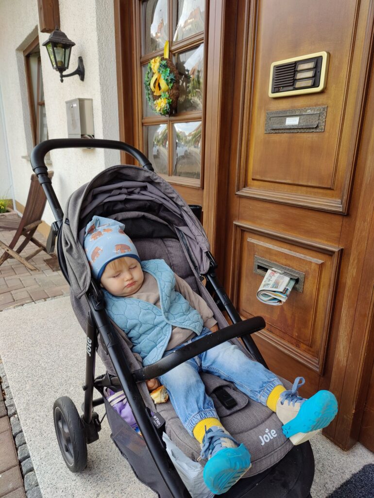 Auf dem Rückweg vom Bäcker hat Mika fast das ganze Käsebrötchen gegessen. Fast… denn mit dem letzten Stück in der Hand ist er im Buggy eingeschlafen. Und hat geschlafen. Auf dem Rückweg. Vor der Tür. Auf dem Arm. Auf dem Sofa. Aber als Mamas Stimme zu hören war, gingen die Augen auf.