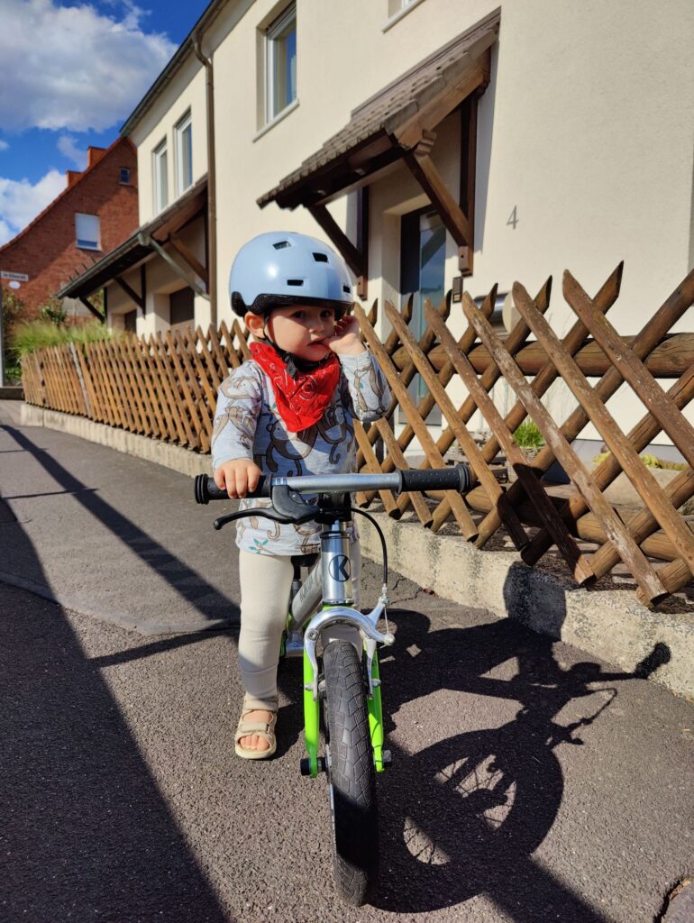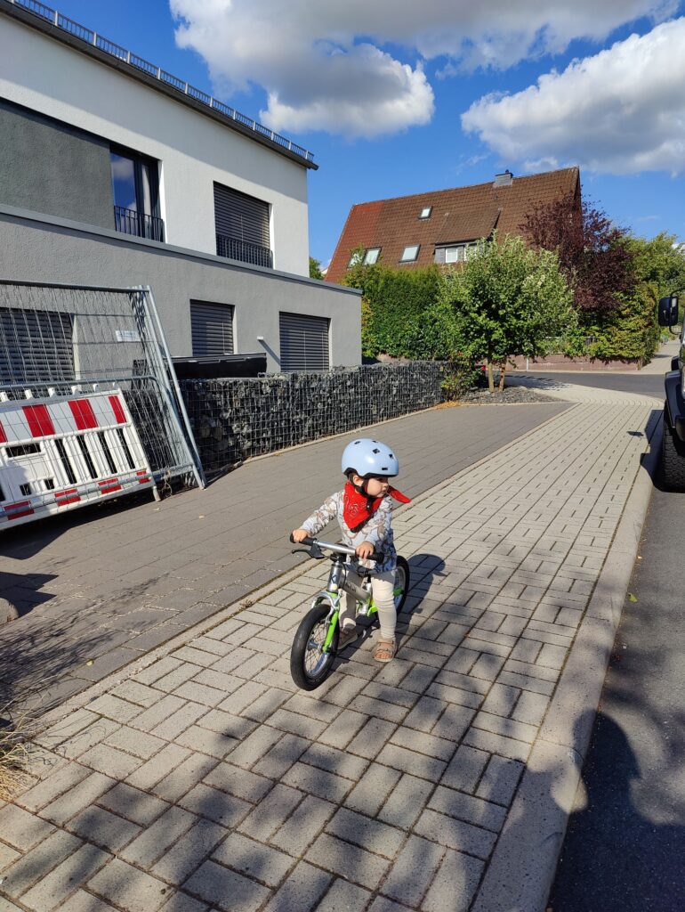 Nachmittags waren Papa und Mika das erste Mal mit dem neuen, gebrauchten Laufzweorad unterwegs. Voll gut. Ist Mika schon gefahren.