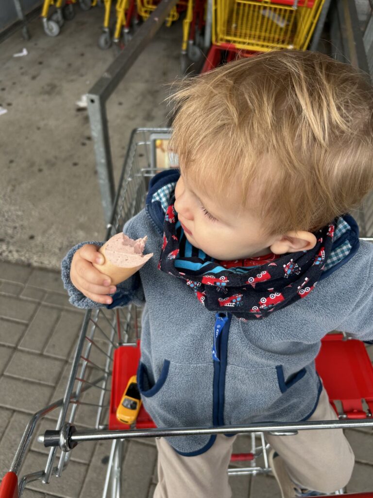 Am Nachmittag sind Mika und Mama dann noch zum Einkaufen gegangen. An der Theke war die Frage, ob der Kleine schon ein Stück Wurst darf. Klar… und warum nicht gleich eine halbe, hahaha. Die Verkäuferin hat es voll gut gemeint. Abends kamen die Großen und es war eine schöne Abendessen Zeit.
