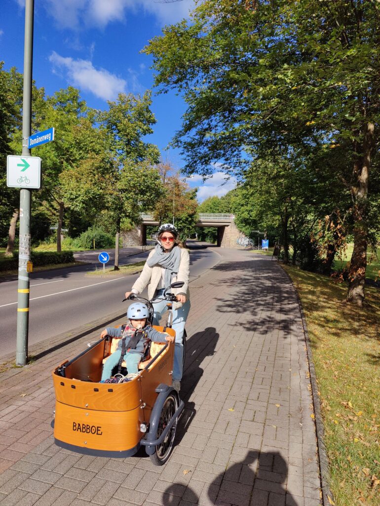 Am Nachmittag sind Mama mit Mika und Papa mit dem Fahrrad in die Stadt gefahren. Die beiden sind mit dem großen Fahrrad gefahren. Das war ein großer Spaß. Und Mama weiß jetzt, wie man damit schaltet.